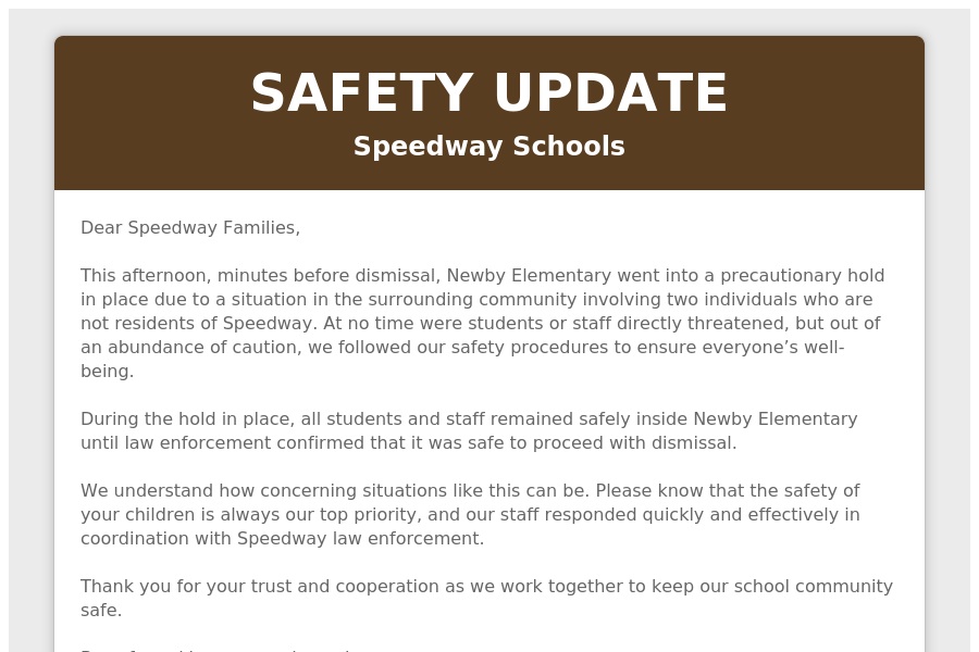 SAFETY UPDATE Speedway Schools Dear Speedway